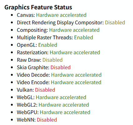 あるユーザーの環境では、video/webm;codecs=vp9,opus を使用して録画した際にCPU使用率が高くなりました。chrome://gpu の「Video Acceleration Information」を確認したところ、以下の状況でした。